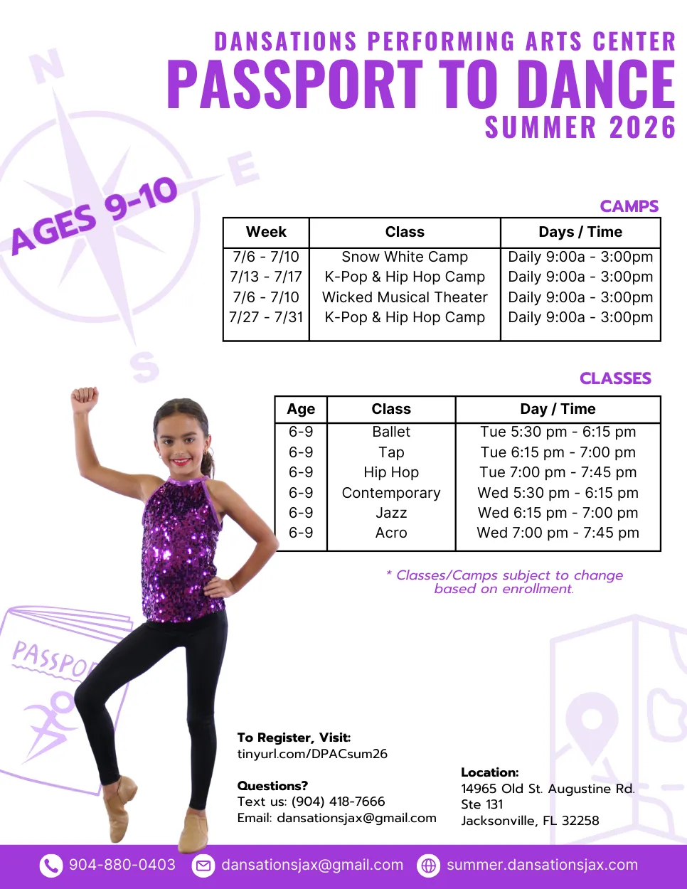 For our dancers ages 9–10, we have two amazing camp themes and a wide variety of classes to choose from! 8 year olds are also eligible to take any of these camps.