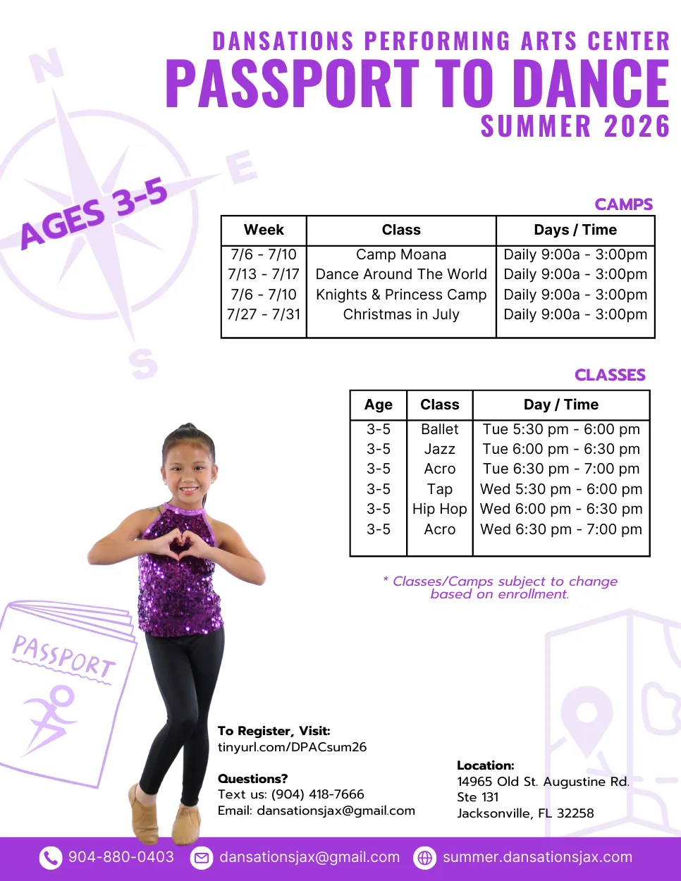 Attire: Dancers should wear form‑fitting athletic clothing. Dance shoes are not required for summer; however, if you’d like to purchase dancewear or shoes, you can click here to place your order. If your dancer will be joining us in the fall, this attire will be required.